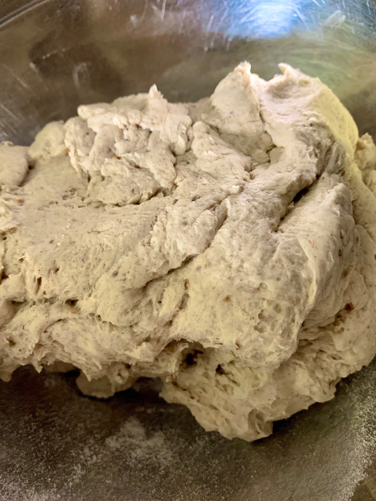 Wer im Bräter backen möchte, soll den Teig nochmal in eine Schüssel geben und ihn an einem warmen Ort 2 bis 4 Stunden gehen lassen und dann aus dem Ofen nehmen und zugedeckt lassen. Der Teig hat nun ordentlich an Volumen gewonnen: