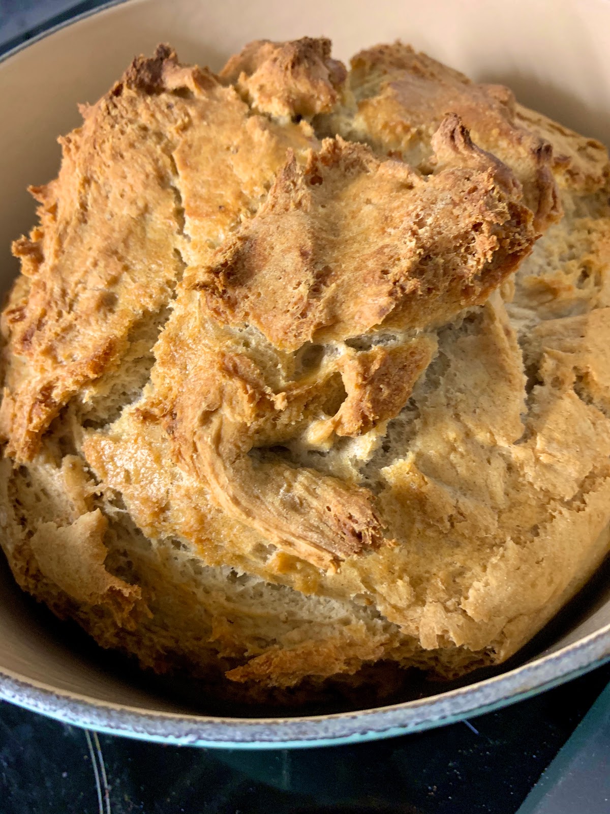 Ich hatte ja ein bisschen Schiss, dass es ein Reinfall wird nachdem sich der Teig nicht so leicht aus der Schüssel löste als ich ihn in den Bräter plumsen ließ aber meine Bedenken waren vollkommen umsonst. Das Ergebnis war ein richtig saftig-fluffiges Brot mit einer wahnsinnig knusprigen Kruste: