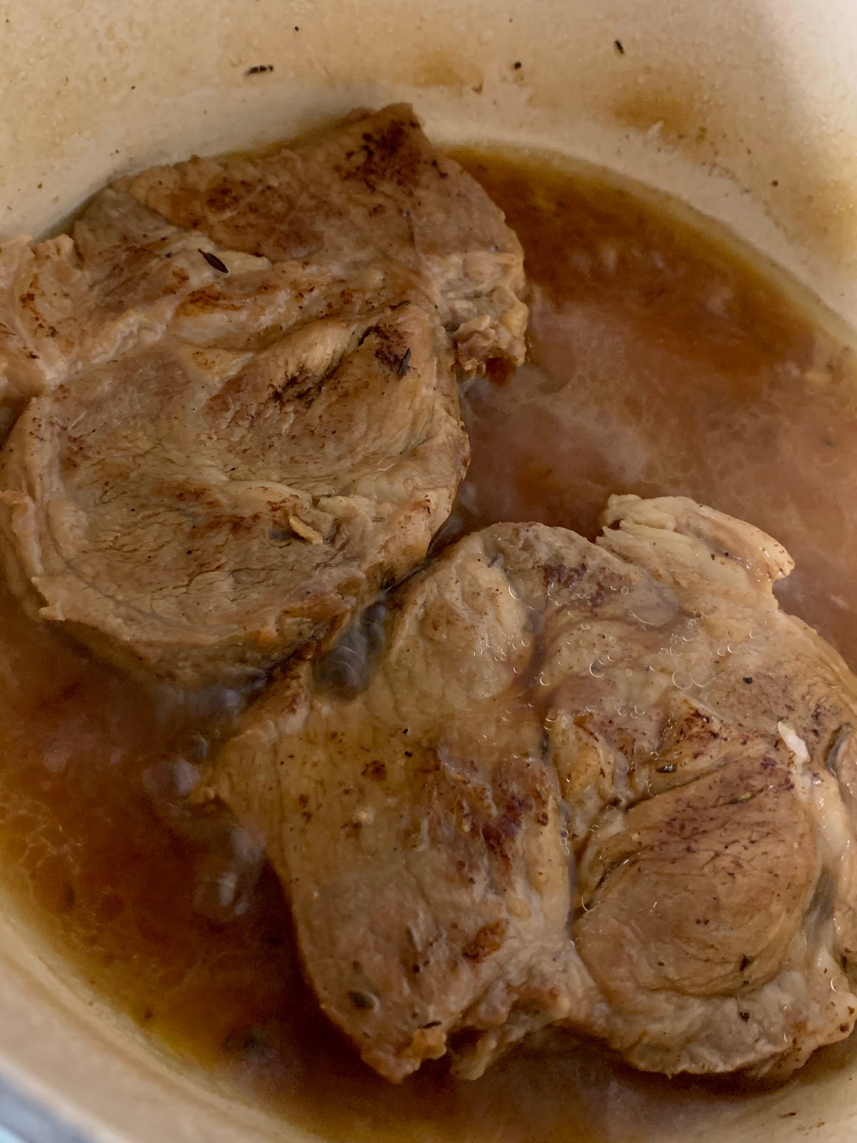 Die Koteletts sind fertig wenn ein klarer, gelber Saft ohne eine Spur von Rosa austritt. Zur Sicherheit könnt ihr einen tiefen Schnitt am Knochen entlang machen. Rechnet damit, dass die Koteletts beim Schmoren etwa 120 ml Bratensaft abgeben. Bis auf 2 Esslöffel wird alles Fett abgeschöpft. Wir gießen den dunklen Bratenfond an und lassen ihn schnell reduzieren. Unter Rühren wird der Bratensaft vom Boden losgekocht.