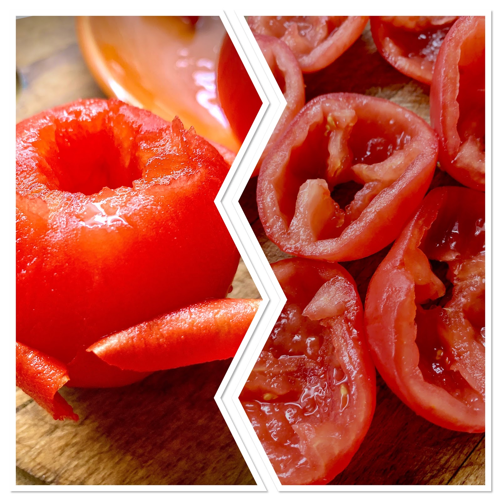 Dass wir mal mehr über das Häuten, Entkernen und Entsaften von Tomaten erfahren ist nicht schlecht, denn viele Rezepte verlangen diese „Vorarbeit“. Ich persönlich hasse diese Tätigkeit aber nach folgender Anleitung geht es sehr einfach und nimmt nicht viel Zeit in Anspruch: