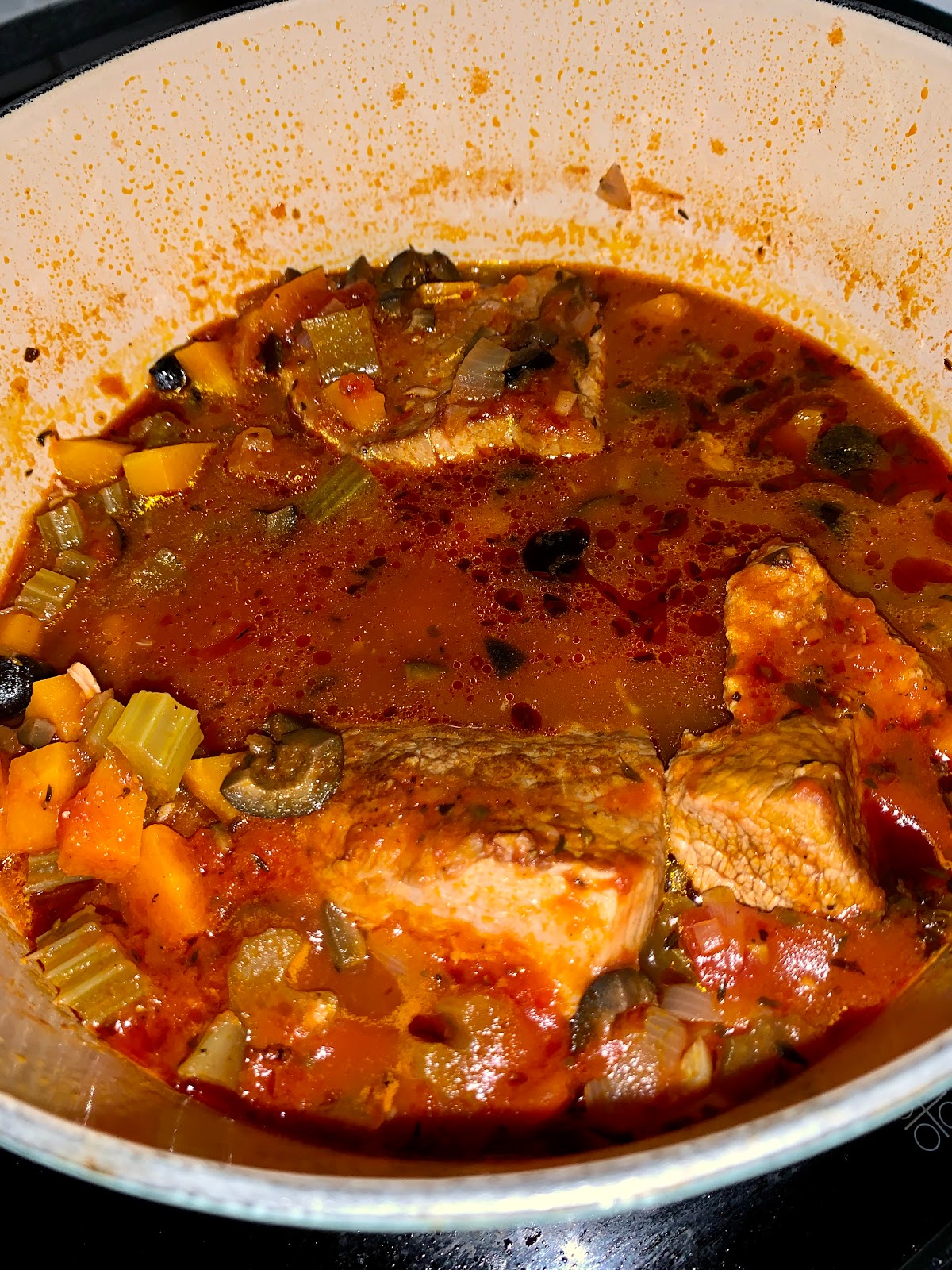 Jetzt den Weißwein einrühren und anschließend die Tomaten dazugeben. Thymian, Oregano, Lorbeerblätter, Salz, Pfeffer und etwas gekörnte Brühe unterrühren und die Beinscheiben wieder in den Bräter geben. Das Fleisch soll mit der Flüssigkeit bedeckt sein (notfalls etwas Wasser dazugeben). Alles zum Köcheln bringen und den Deckel drauf.