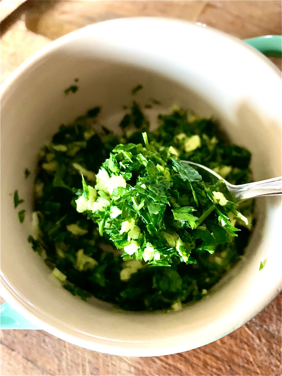 Die Petersilie waschen und mit Küchenpapier trockentupfen. Mit einem Wiegemesser oder im Thermomix keinhacken und in ein Schüsselchen füllen. Biozitronen waschen und die Schale dünn abziehen, so dass möglichst kein weißer Schalenanteil dabei ist. In sehr feine Würfel schneiden und mit der Petersilie vermischen. Dann die Knoblauchzehen abziehen, ebenfalls klein schneiden und mit der Petersilie und der Zitrone vermischen.