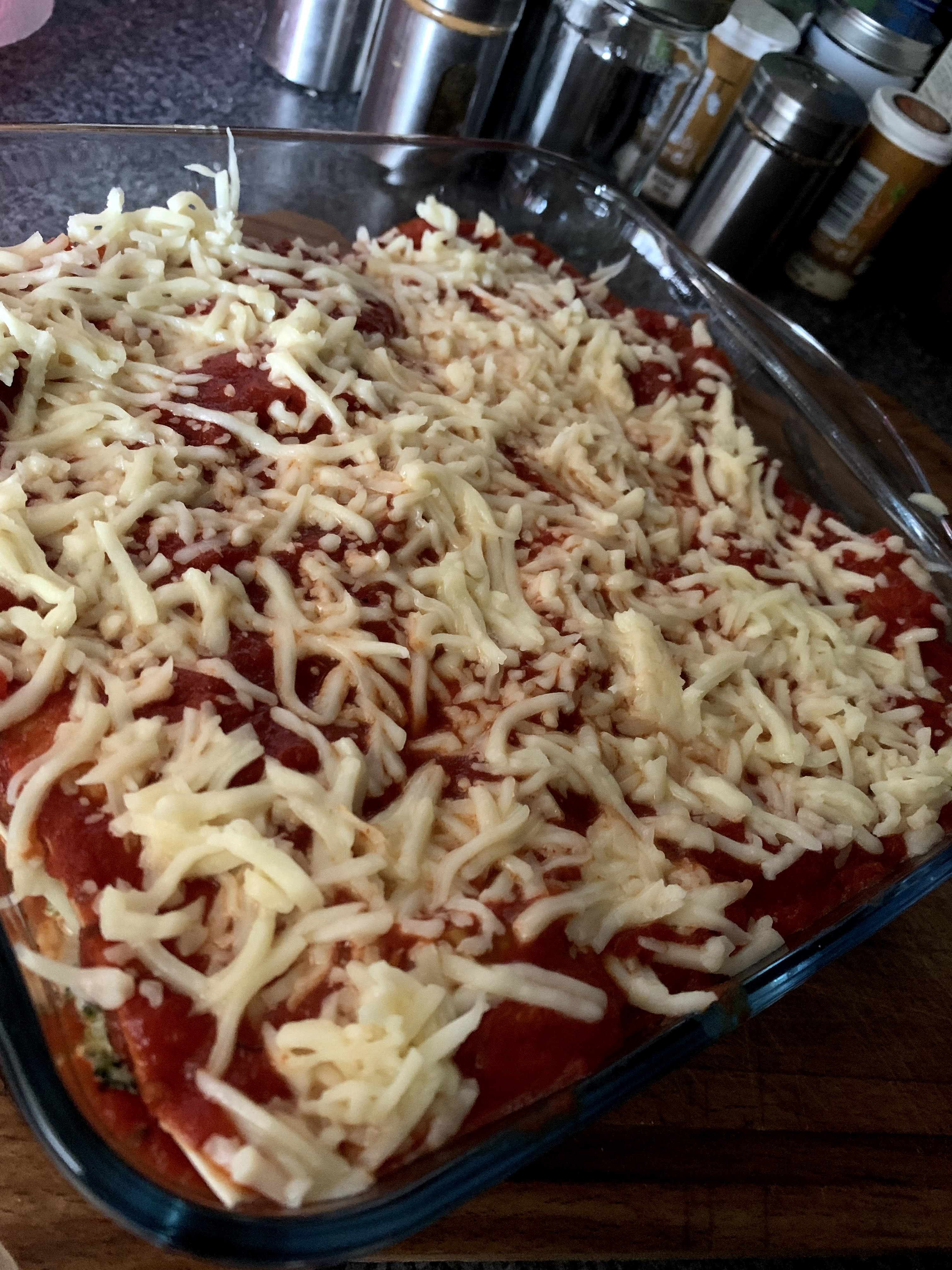 Auflaufform holen und dann wie folgt schichten: Gemüsemasse, Lasagneplatten, Tomatensoße – Gemüsemasse, Lasagneplatten, Tomatensoße und anschließend mit dem restlichen Käse bestreuen. Ab damit in den Ofen und bei Heißluft ca. 180 Grad etwa 30 Minuten überbacken.