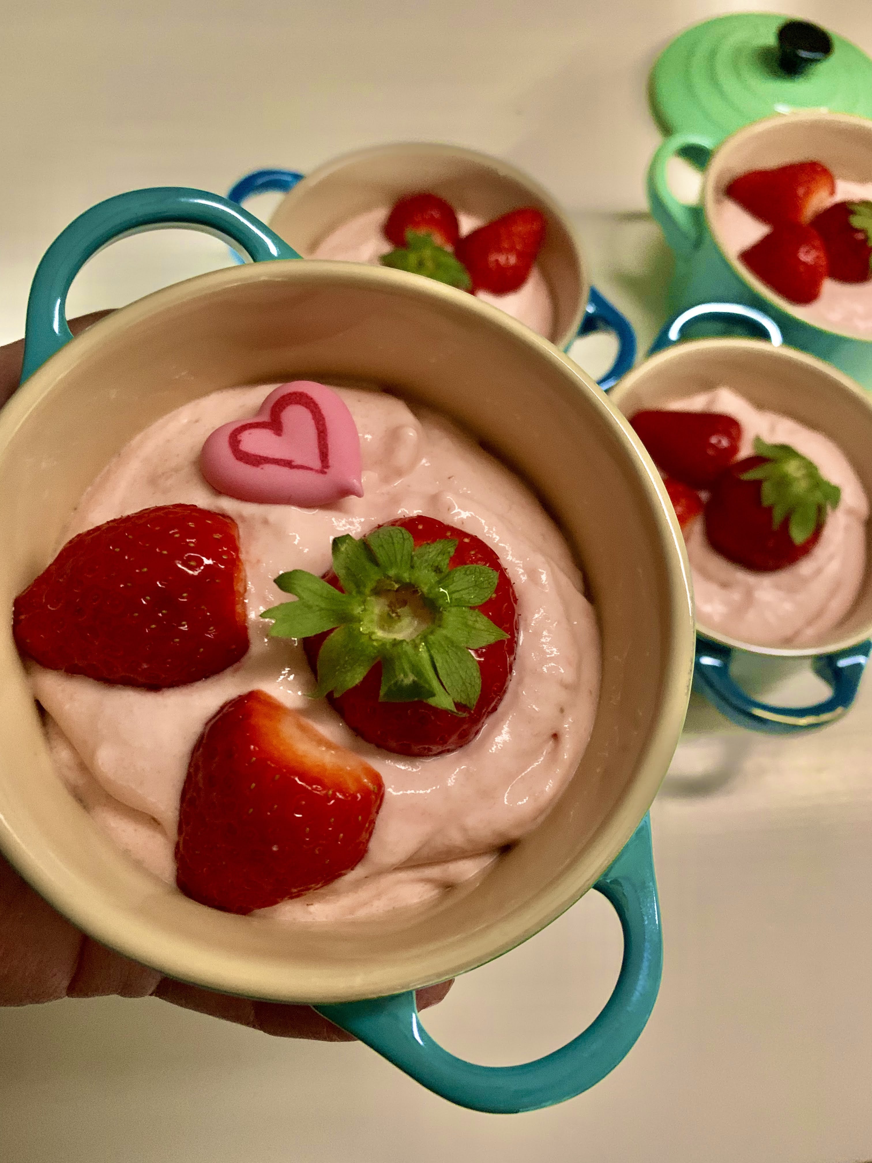 Dann Mascarpone und griechischen Joghurt dazugeben und ebenfalls gut mixen. Anschließend ein Tütchen Gelatine Fix einrühren und die Creme in die Dessertgläser füllen. 1-2 Stunden im Kühlschrank kühlen und kurz vor dem Servieren mit den übrig gebliebenen Erdbeeren und den Zuckerherzen nach Belieben dekorieren.