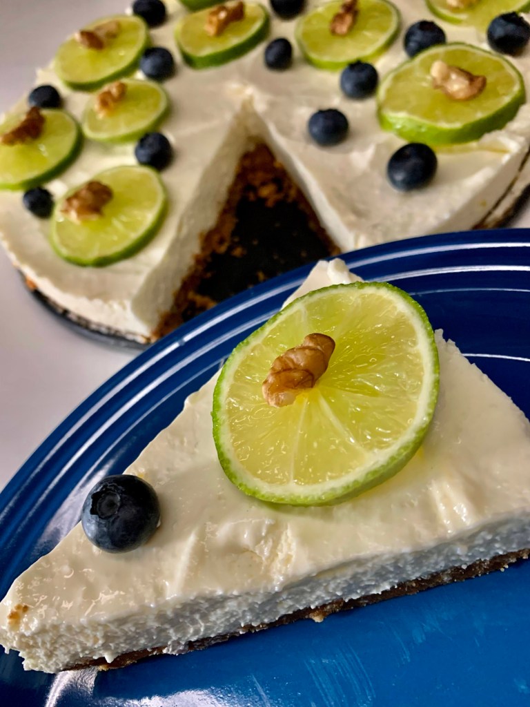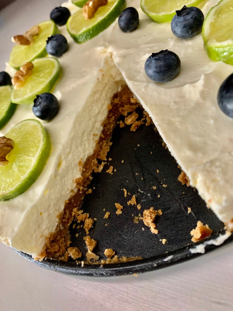 Kurz vor dem Servieren den Kuchen mit den Limettenscheiben, den Heidelbeeren und den Walnüssen verzieren.