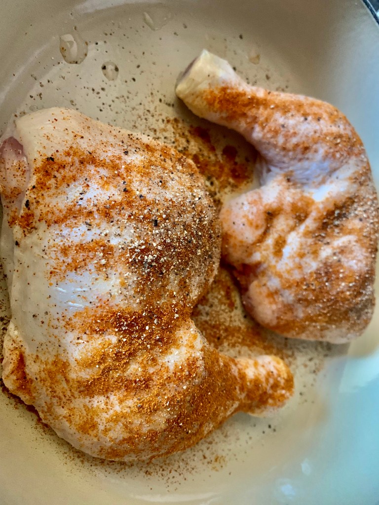 Ofen auf 180 Grad Umluft vorheizen. Hähnchenschenkel abwaschen, trockenreiben und mit Paprikapulver, Salz und Pfeffer von beiden Seiten würzen. Hähnchenschenkel in eine feuerfeste Pfanne oder Bratreine geben und im Ofen braten.