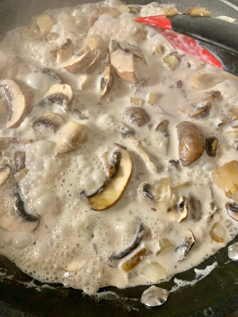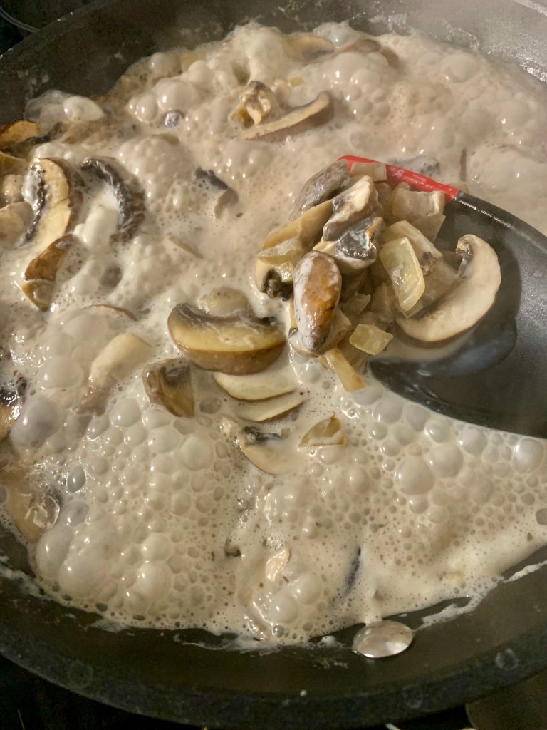 Speisestärke in ca. 10 ml Milch auflösen. Die übrige Milch und die Sahne in die Pfanne geben und anschließend die aufgelöste Speisestärke dazu geben. Alles kurz aufkochen lassen und mit Salz, Pfeffer und der gekörnten Brühe würzen. Gehackte Petersilie in die Sauce rühren.
