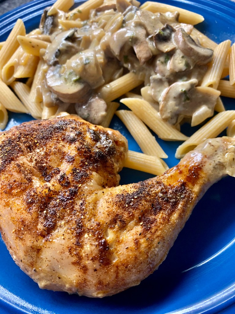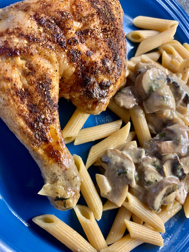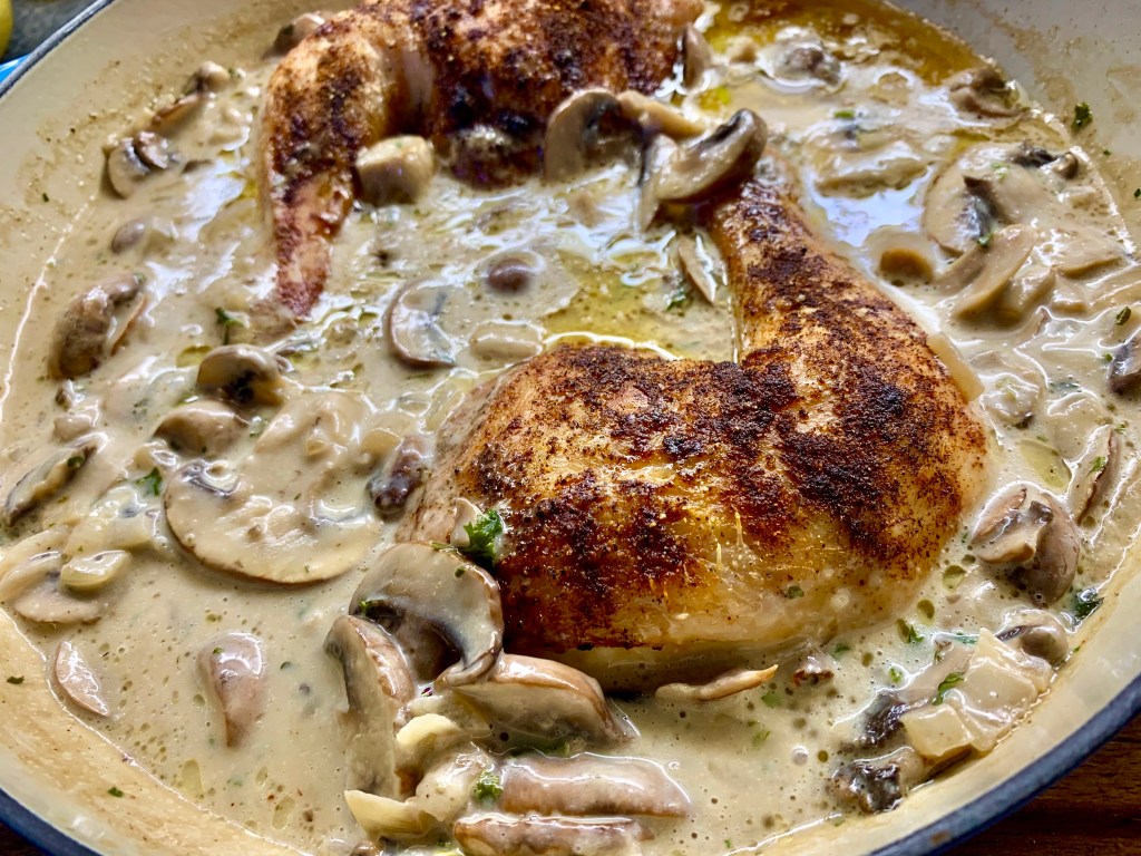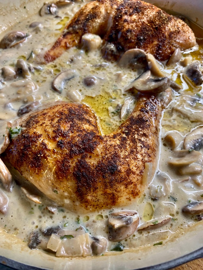Die Sauce nun zu den Hähnchenschenkel in die Pfanne geben und alles zusammen noch ca. 15-20 Minuten garen. Die Hähnchenschenkel sollten insgesamt 1,5 Stunden braten.