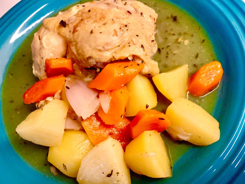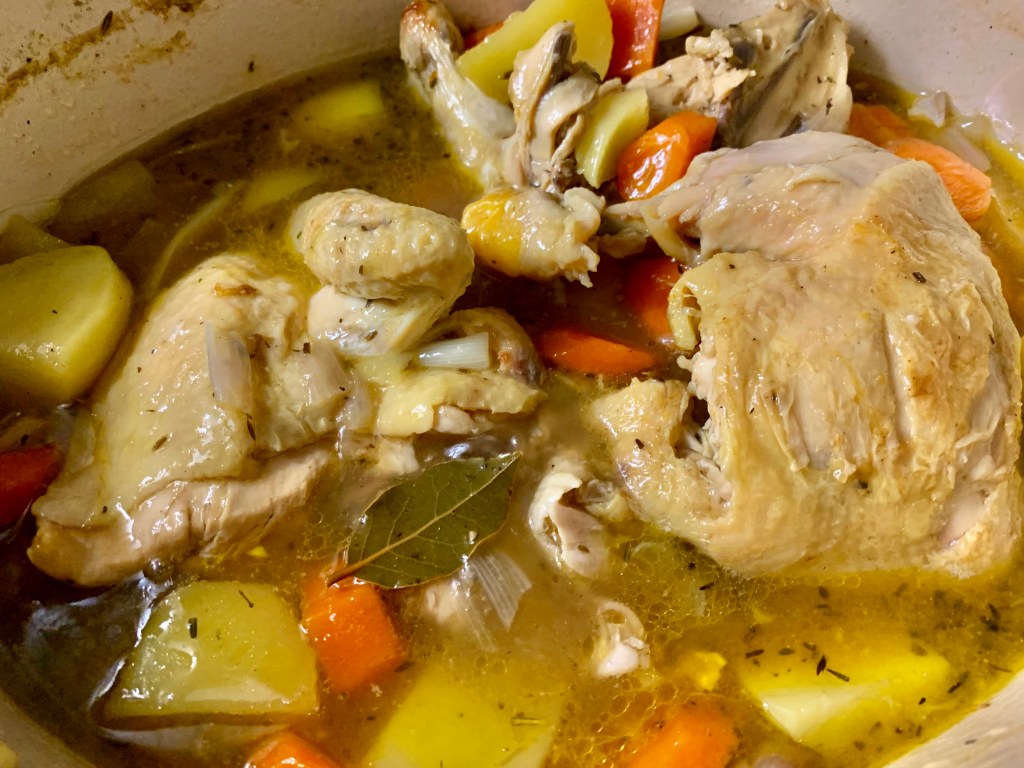 Karotten, Lauchzwiebel und Schalotten schälen und in mundgerechte Stücke schneiden. Kartoffeln ebenfalls schälen und der Länge nach vierteln. Das Gemüse dann nach 45 Minuten zum Huhn dazugeben und weitere 45 Minuten mitschmoren lassen.