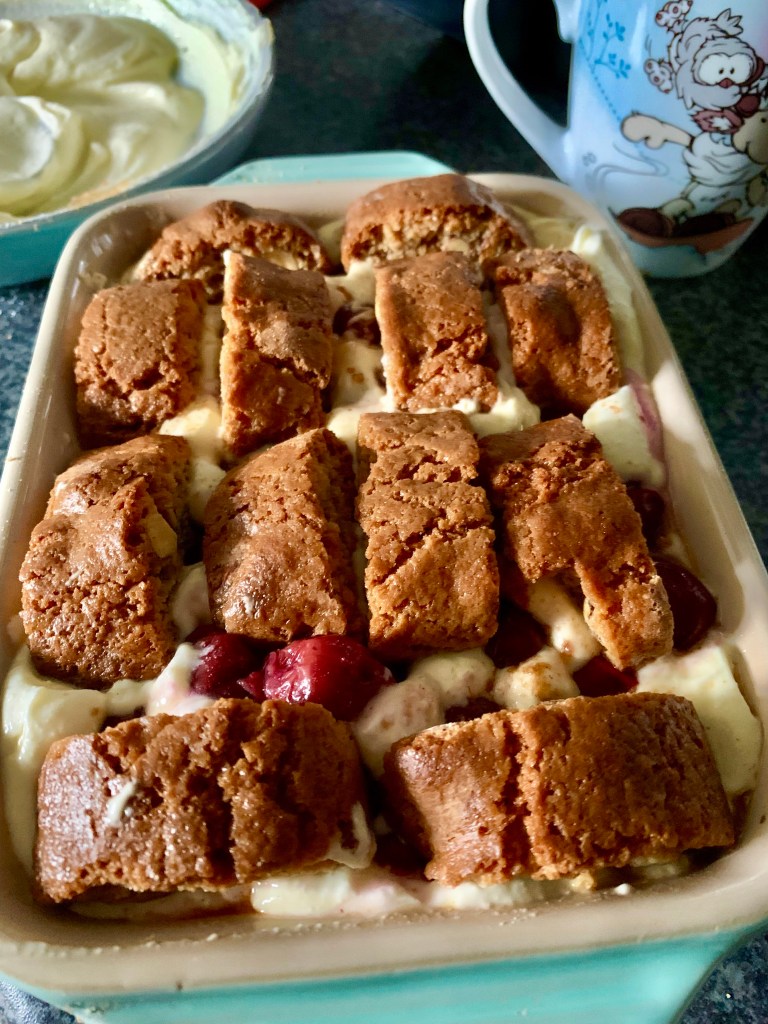 Espresso kochen und darin 1 TL Zimt verrühren. Die Sauerkirschen gut abtropfen lassen. Die Hälfte der Cantuccini in die Form legen und mit dem Espresso beträufeln.
