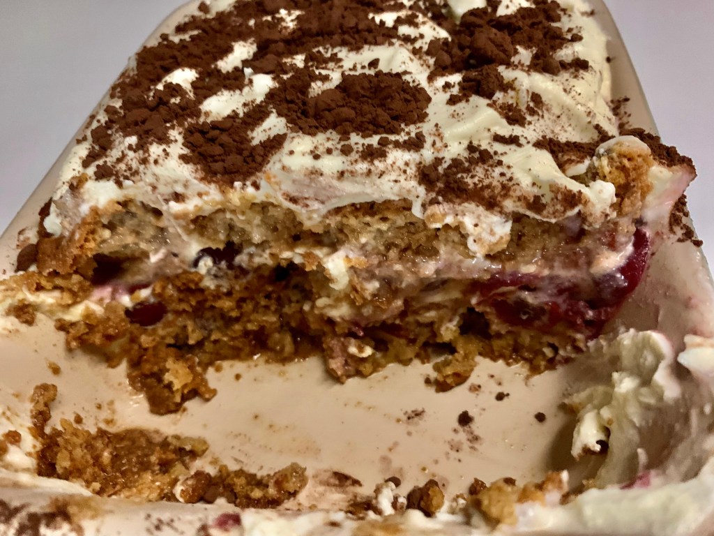 Mascarpone, Mandelextrakt, Quark und Zucker miteinander zu einer glatten Masse verrühren. Die Hälfte der Masse auf den Cantuccini verteilen und obendrauf die Sauerkirschen geben. Nun die übrigen Cantuccini darauflegen und mit dem restlichen Espresso beträufeln. Die restliche Creme darauf verteilen und mindestens 4 Stunden in den Kühlschrank stellen. Kurz vor dem Servieren das Dessert mit Kakao bestäuben.
