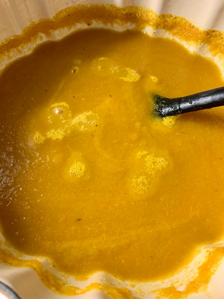 Mit der Rinderbrühe aufgießen. Das Gemüse sollte gut bedeckt sein. Alles nun ca. 20 Minuten kochen und dann den fein geschnittenen Ingwer dazugeben. Weitere 10 Minuten kochen lassen und dann fein pürieren. Ein Schuss Sahne dazu und mit Salz, Paprika und Curry abschmecken (evtl. noch eine Prise frisch gemahlenen Pfeffer). Ich gebe gerne noch ein paar Tropfen Kürbiskernöl auf die Suppe, ehe ich sie serviere.