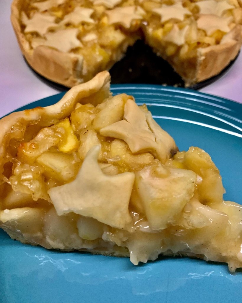 Den restlichen selbstgerechten Teig bzw. den zweiten Teig aus der Kühlung ausrollen und die Sterne oder andere Motive ausstechen und auf der Apfelfüllung verteilen. Die Tarte wird dann 40 Minuten bei 175 Grad Umluft gebacken.