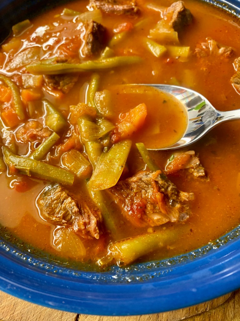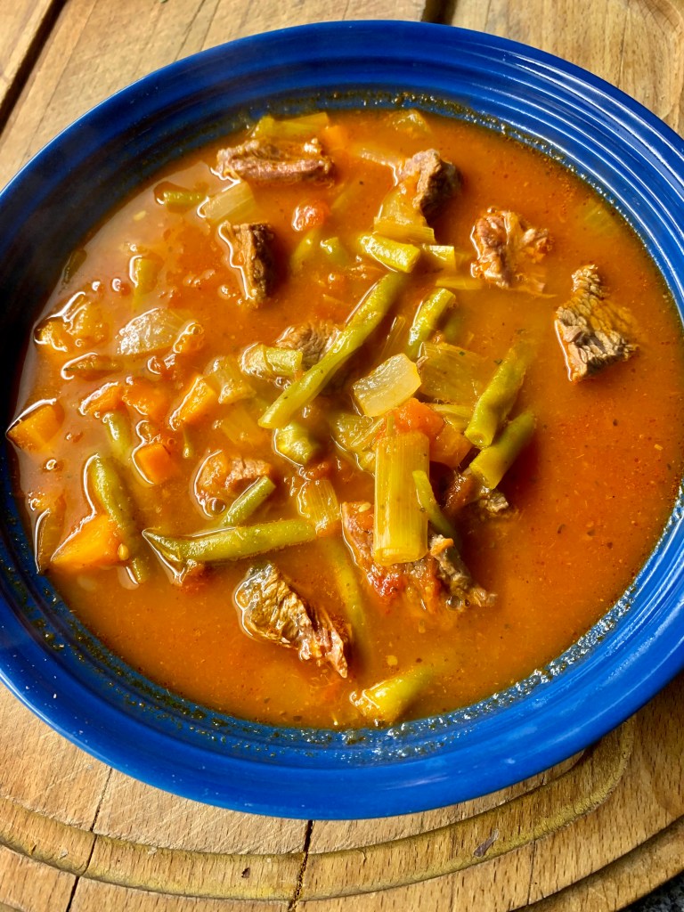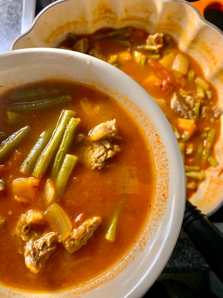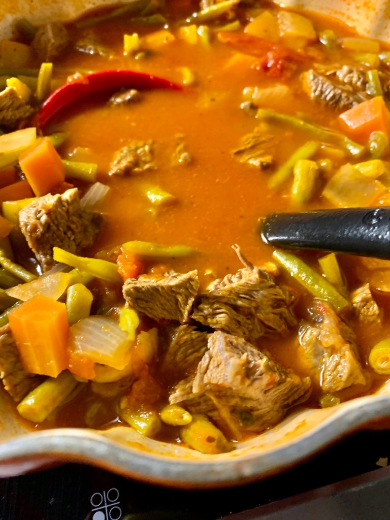 Das Suppenfleisch zusammen mit der gekörnten Rinderbrühe und einer Prise Zucker in einen Topf mit soviel Wasser geben, dass das Fleisch gut bedeckt ist und kurz aufkochen lassen. Temperatur dann soweit nach unten drehen, dass das Fleisch nur noch köchelt. Zwischendurch den sich bildenden Schaum abschöpfen. Während das Fleisch kocht, das Gemüse waschen und in Streifen oder Würfel schneiden. Nach ca. 1,5 Stunden das Fleisch herausnehmen und in mundgerechte Stücke schneiden. Fleisch und Currypaste dann zusammen mit den Dosentomaten und dem restlichen Gemüse in die Suppe geben (Paste gut verrühren) und alles nochmal 30 bis 40 Minuten gar kochen.