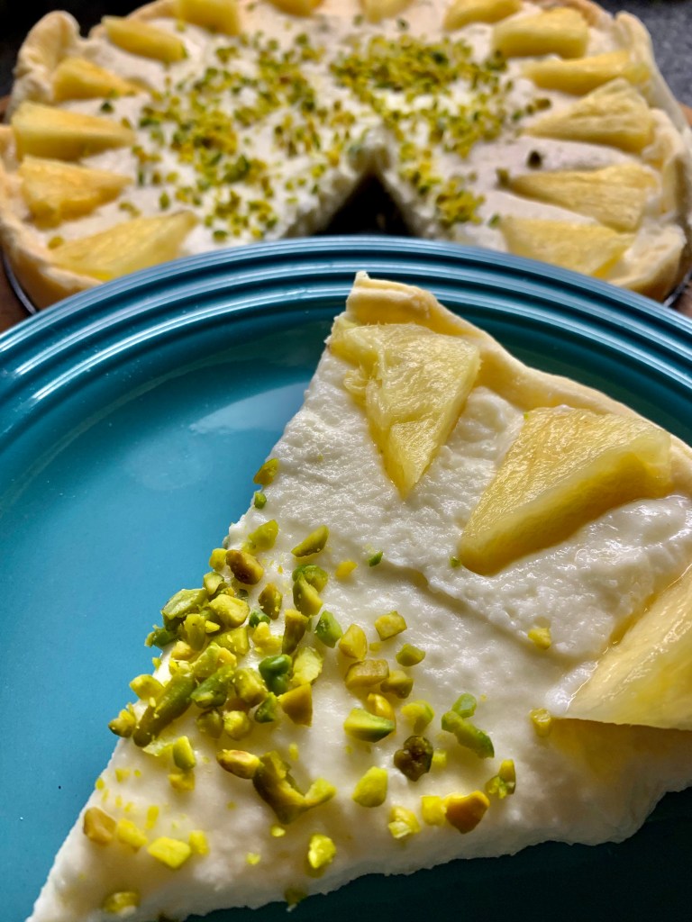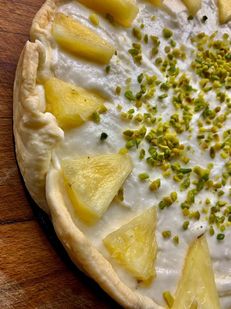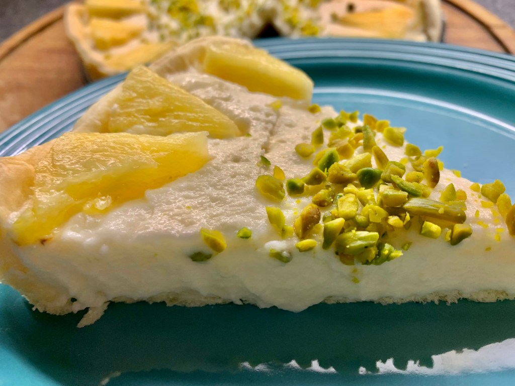 Für die Deko die Ananasscheiben in kleine Stücke schneiden und gleichmäßig am äußeren Rand verteilen. Die Pistazien mit einem Löffel in der Mitte der Tarte verteilen.