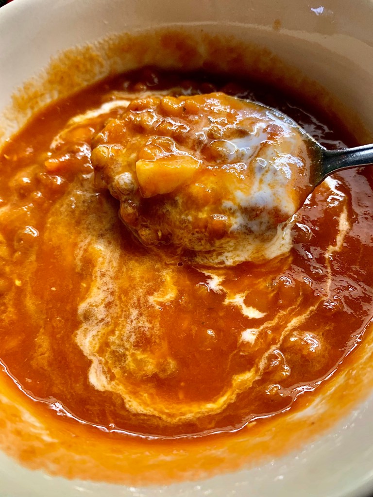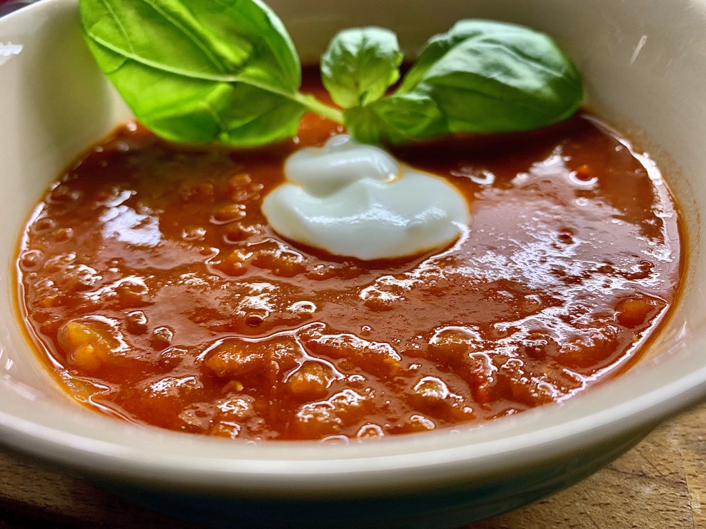 Schließlich die Linsen, Dosentomaten, den Zucker und die Gemüsebrühe dazugeben und ca. 20 Minuten bei schwacher Hitze köcheln lassen. Mit Salz und Pfeffer abschmercken. Vor dem Servieren einen ordentlichen Klecks Saurahm dazugeben und mit Basilikumblättern oder gehackter Petersilie oder Koriander garnieren.